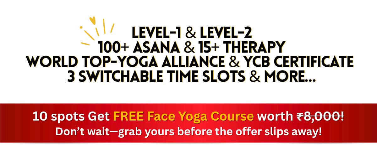 Turn your passion for yoga into a profession! Our Yoga Teacher Training Course is internationally certified by World Top - Yoga Alliance, Yoga Certification Board (Ministry of AYUSH, Govt. of India), and Indian Yoga Association." Includes Level-1 & Level-2, 100+ Asana, 15+ Therapy, 3 - Switchable Time Slots & More...