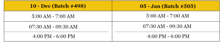 Type 1 - Monday to Friday IST: Mon - Fri 5AM - 7AM, 7:30AM - 9:30AM & 4PM - 6PM (switchable time)